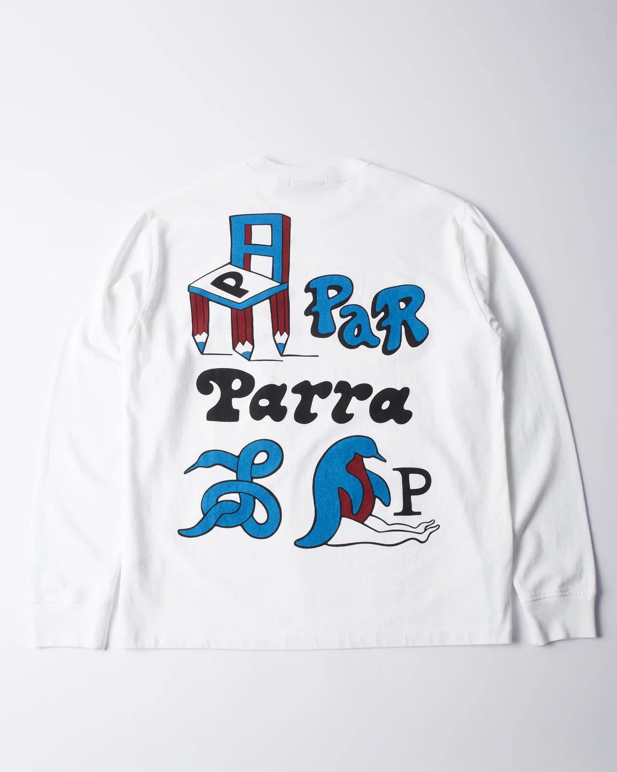 Chair pencil artwork as a waterbased screenprint at the back and a logo print at the chest. All Parra longsleeves are a boxy custom fit.